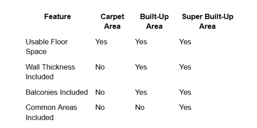 Comprehensive Space Assessment: Accounts for shared amenities and common areas that add value to the property. Pricing Factor: Builders often calculate the property cost based on super built-up area, making it a crucial metric.